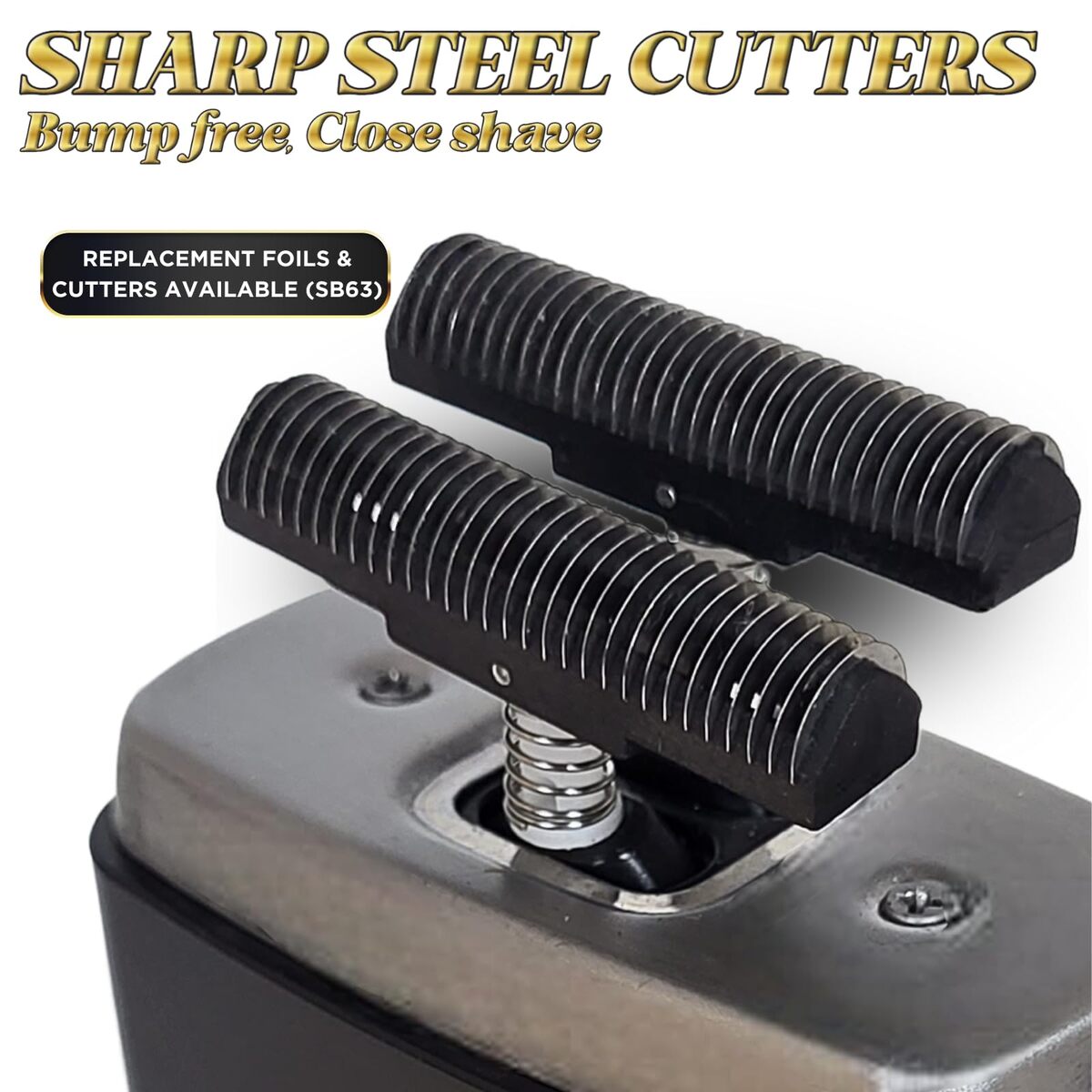 Professional Double Foil Shaver: Delivers an ultra-close, barber-quality shave on face, head, and hairline. Perfect for fades, finishing stubble, and bald looks at home or in the shop.,Waterproof Wet/Dry Design (IPX6): Safe to use in the shower or on dry skin. Easy to rinse and clean for long-lasting performance.,Cordless or Corded with Extended Runtime: Runs up to 150 minutes on a powerful lithium battery. Hidden LCD display shows remaining charge. Dual voltage for worldwide travel.,Hypoallergenic Foils Replaceable Cutters: Gentle on sensitive skin while providing a smooth, bump-free shave. Replacement cutters model SB63 available separately.,Complete 9-Piece Kit: Includes shaver, charging stand, USB cable, 3 cleaning brushes, foil guard, and a hard-shell travel case?everything you need for professional grooming on the go.