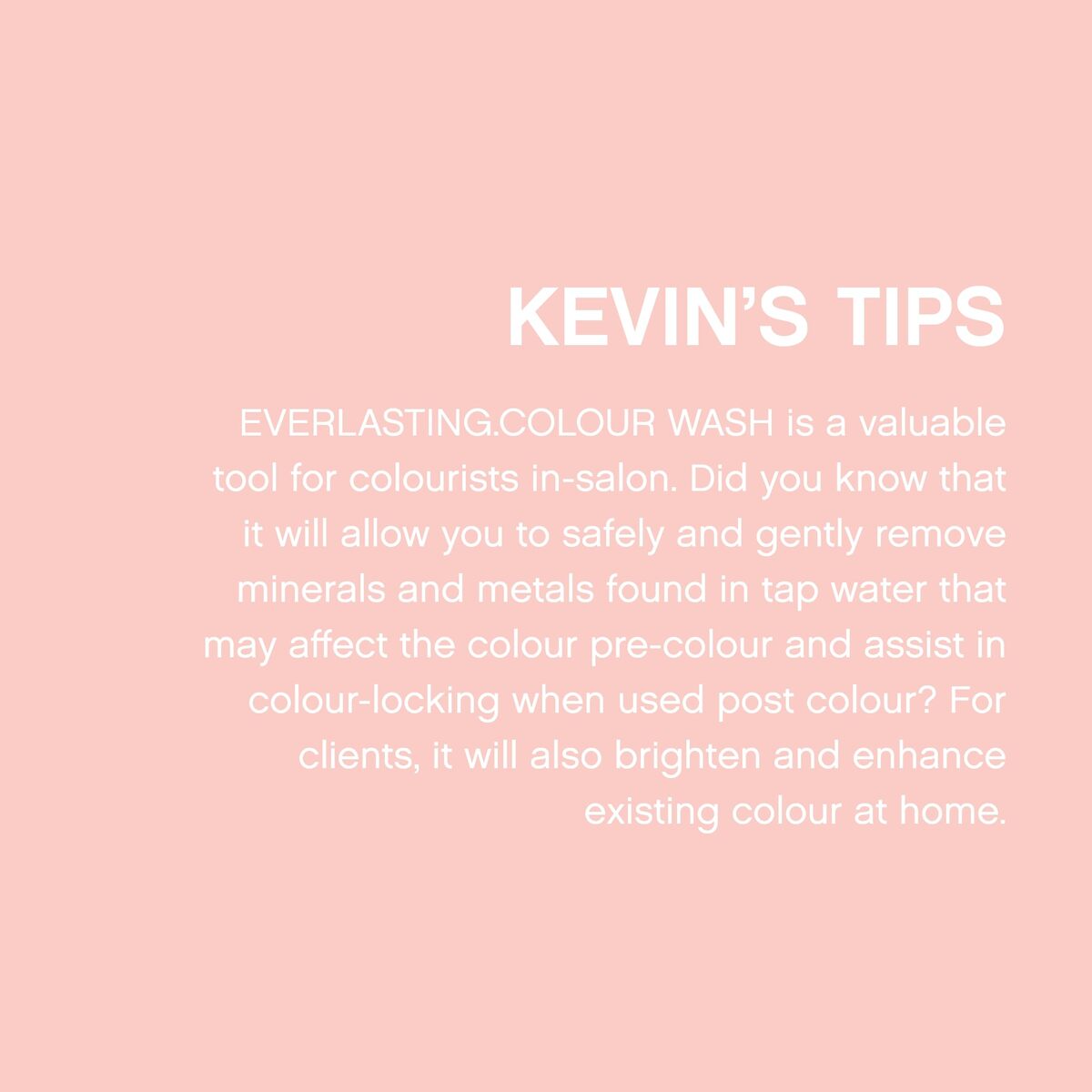 Colour Hair Care Shampoo: EVERLASTING.COLOUR WASH is a colour protect shampoo that locks in colour while protecting hair from hard water mineral accumulation,Shampoo for Hair Shine: This colour shampoo gently cleanses and closes the cuticle for shine, offering the ultimate defense for brilliant, colour-rich hair,Acidic pH Shampoo: Our pH balanced shampoo gently purifies without stripping colour, keeping your hair nourished and hydrated,Sulphate Paraben Free: Our colour safe shampoo caters to coloured hair, offering a hair treatment free from sulphates or parabens,About KEVIN.MURPHY: KEVIN.MURPHY products provide the tools to recreate high-fashion runway looks in the salon or at-home, while always remaining kind to the environment