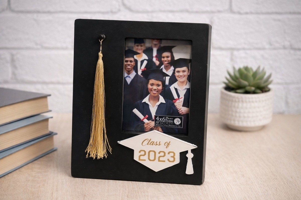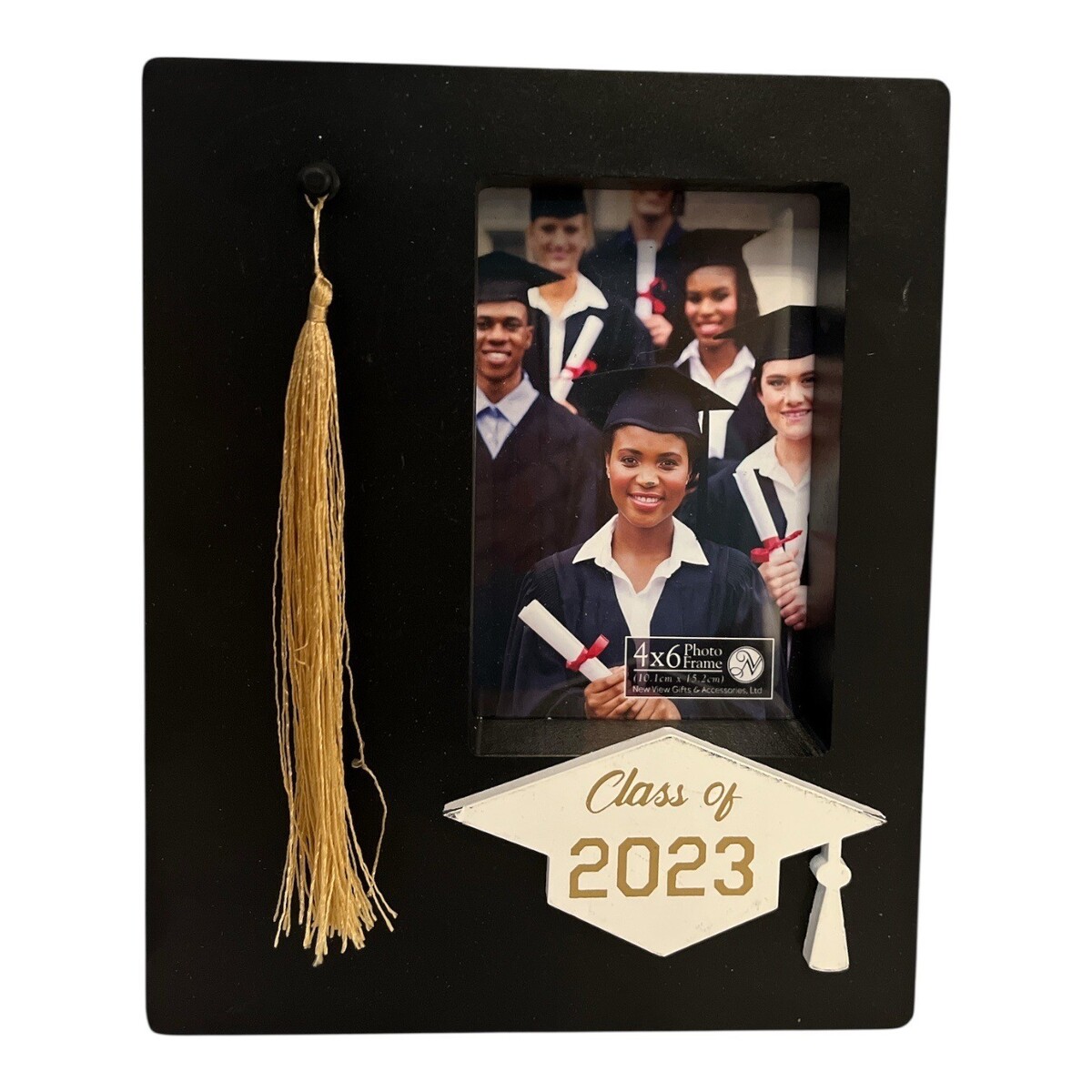 Decorative graduation shadow box frame featuring a black matte finish, gold tassel accent, and raised ?Class of 2023? mortarboard plaque. Designed to display a 4x6 photo with dimensional depth, making it a meaningful keepsake for celebrating graduation milestones. Can be displayed on a wall or shelf.