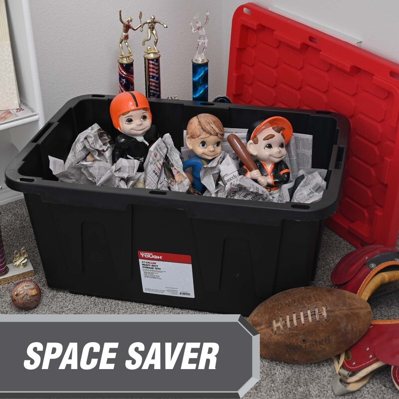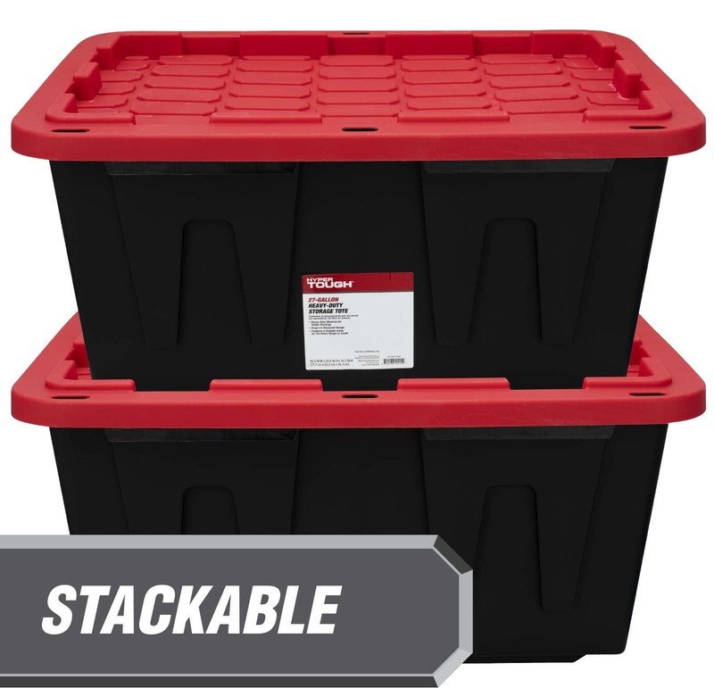 Organize clutter and hide unused items with the Hyper Tough 27 Gallon Snap-Lid plastic storage bin featuring a black base and red lid. This durable plastic container is built from long-lasting polypropylene to resist rust, dents, stains, and peeling perfect for daily use indoors or outdoors. This storage box is ideal for everything from seasonal gear and sporting equipment to gardening tools and pet supplies. The red snap lid not only adds a pop of color but also provides a secure 2-point closure, making this one of the most reliable storage bins with lids. The specially molded lids for storage bins are designed for easy stacking, giving you stackable storage bins that maximize your space. Also available in multiple sizes in clear and red (15 Gallon and 27 Gallon) or in black and red (5 Gallon, 12 Gallon, 17 Gallon, 27 Gallon, 40 Gallon, 50 Gallon). Whether you're storing items in the basement, closet, shed, attic, or garage, this versatile storage tote offers a clutter-free solution. It's also great for organizing kids? toys use it as one of your go-to toy boxes or storage containers for games and gear. The six built-in tie-down holes make the lid lockable with zip-ties or padlocks, giving you a secure outdoor storage box or patio storage box when needed. Use it to store shoes, clothing, tools, or hobby supplies?this all-purpose storage container storage solution handles it all.