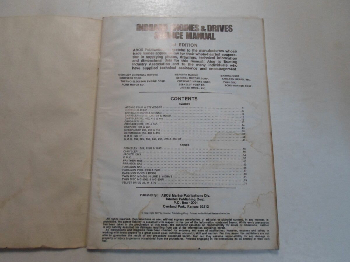 1978 ABOS INBOARD ENGINES DRIVES SERVICE REPAIR SHOP MANUAL WATER DAMAGED