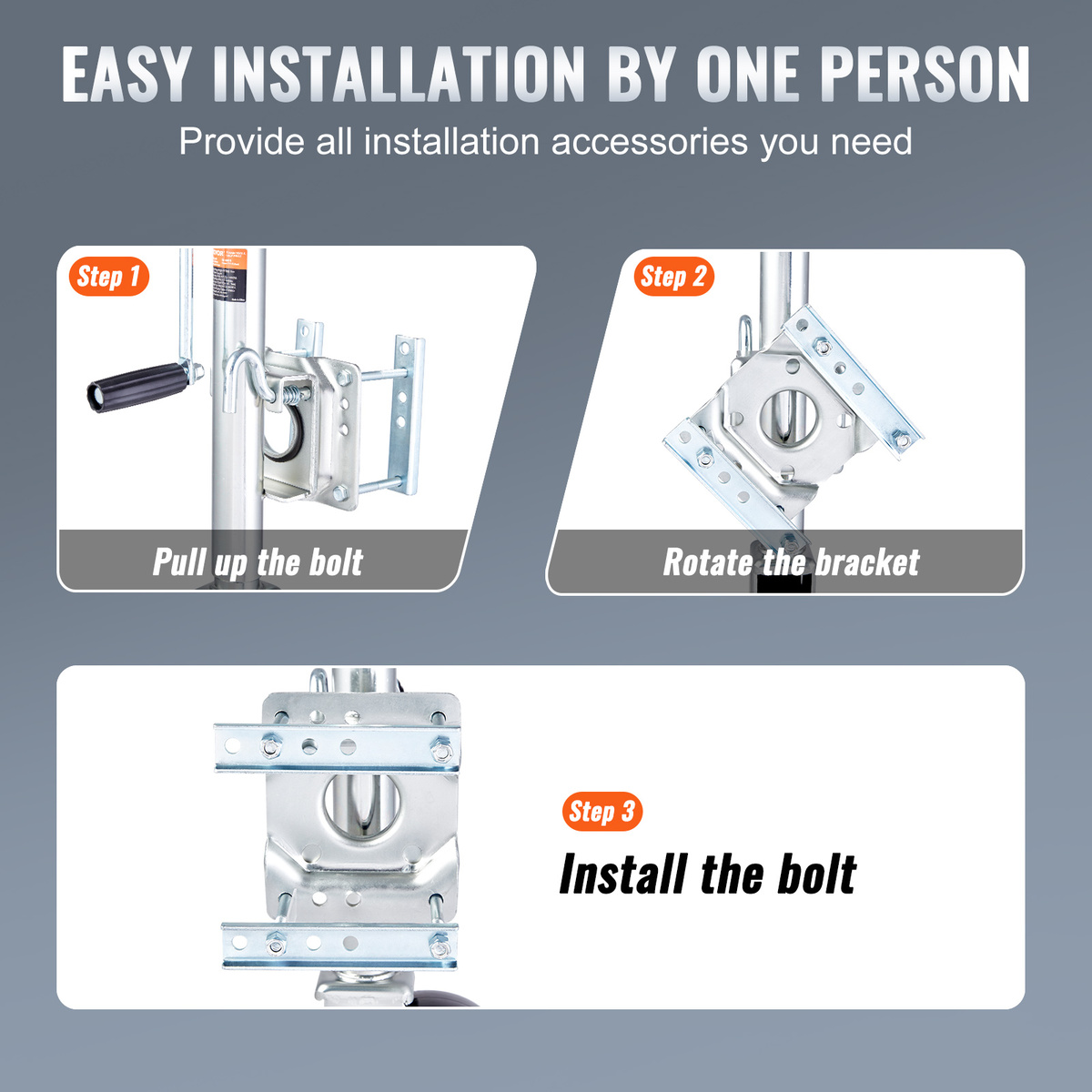 Easy Installation: Our boat trailer jack comes with all the necessary parts and detailed assembly instructions. It can be bolted or welded onto the trailer tongue and has a swivel function that allows it to swing up parallel to the tongue for easy maneuverability.
