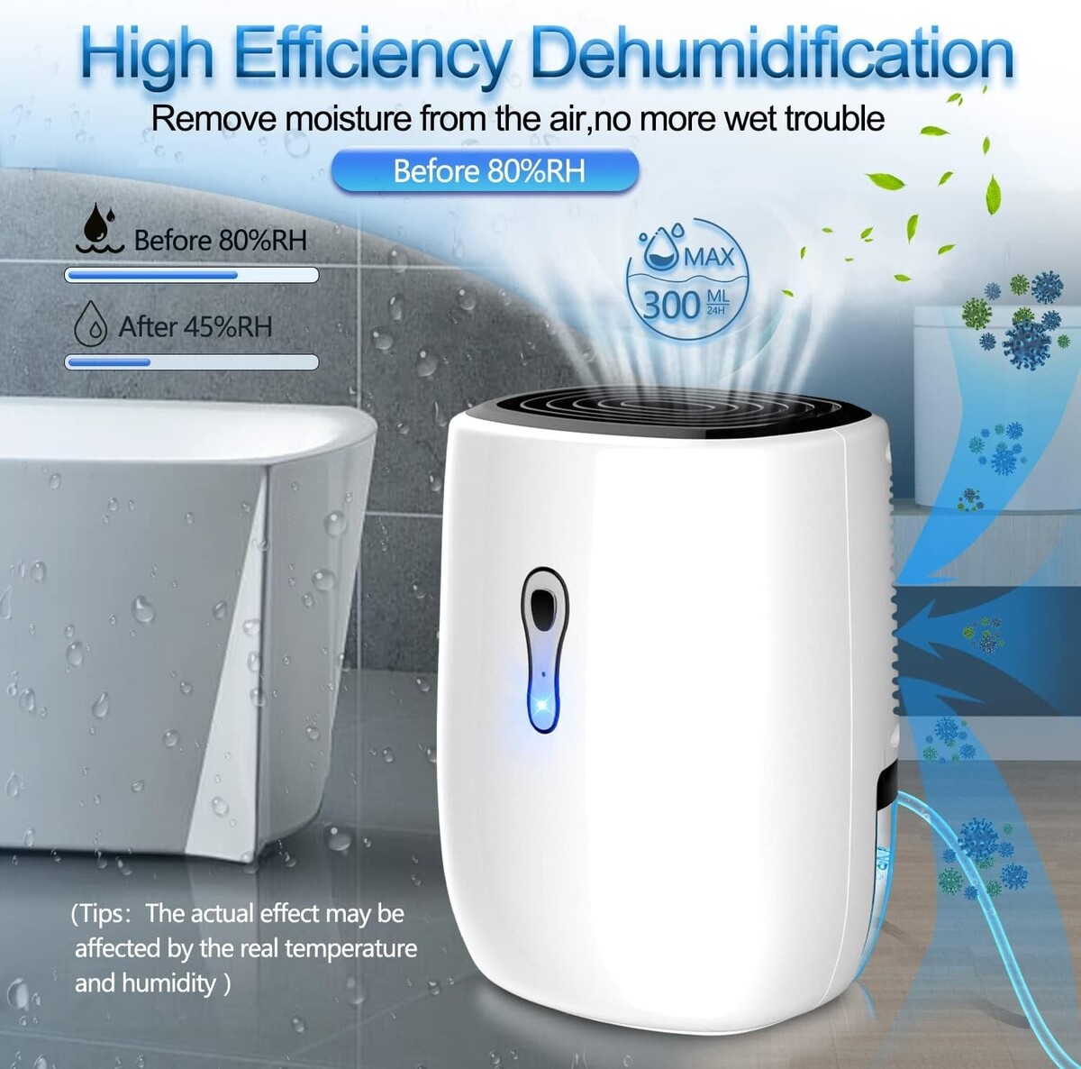 Efficient Moisture Extraction: This small dehumidifier, with a 27oz (800ml) water tank, can extract up to 350ml (12 ounces) of moisture daily in enclosed spaces at 86? and 80% RH.