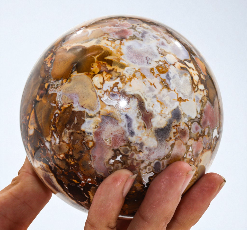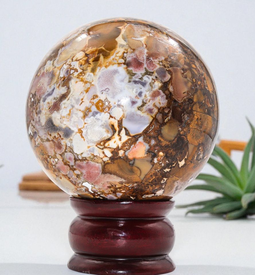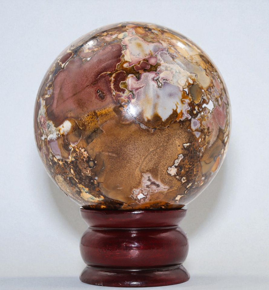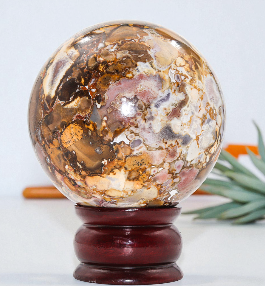 This is a stunning Brown, Yellow, Pink and White color King Cobra Skin Jasper Sphere,