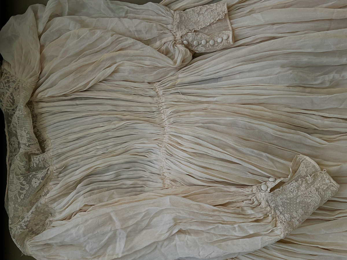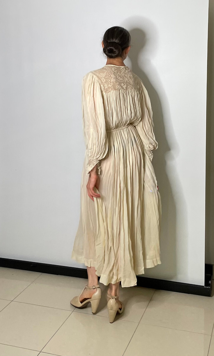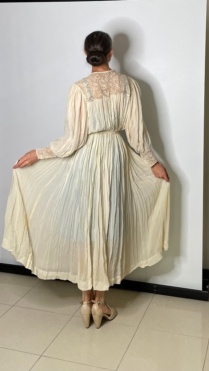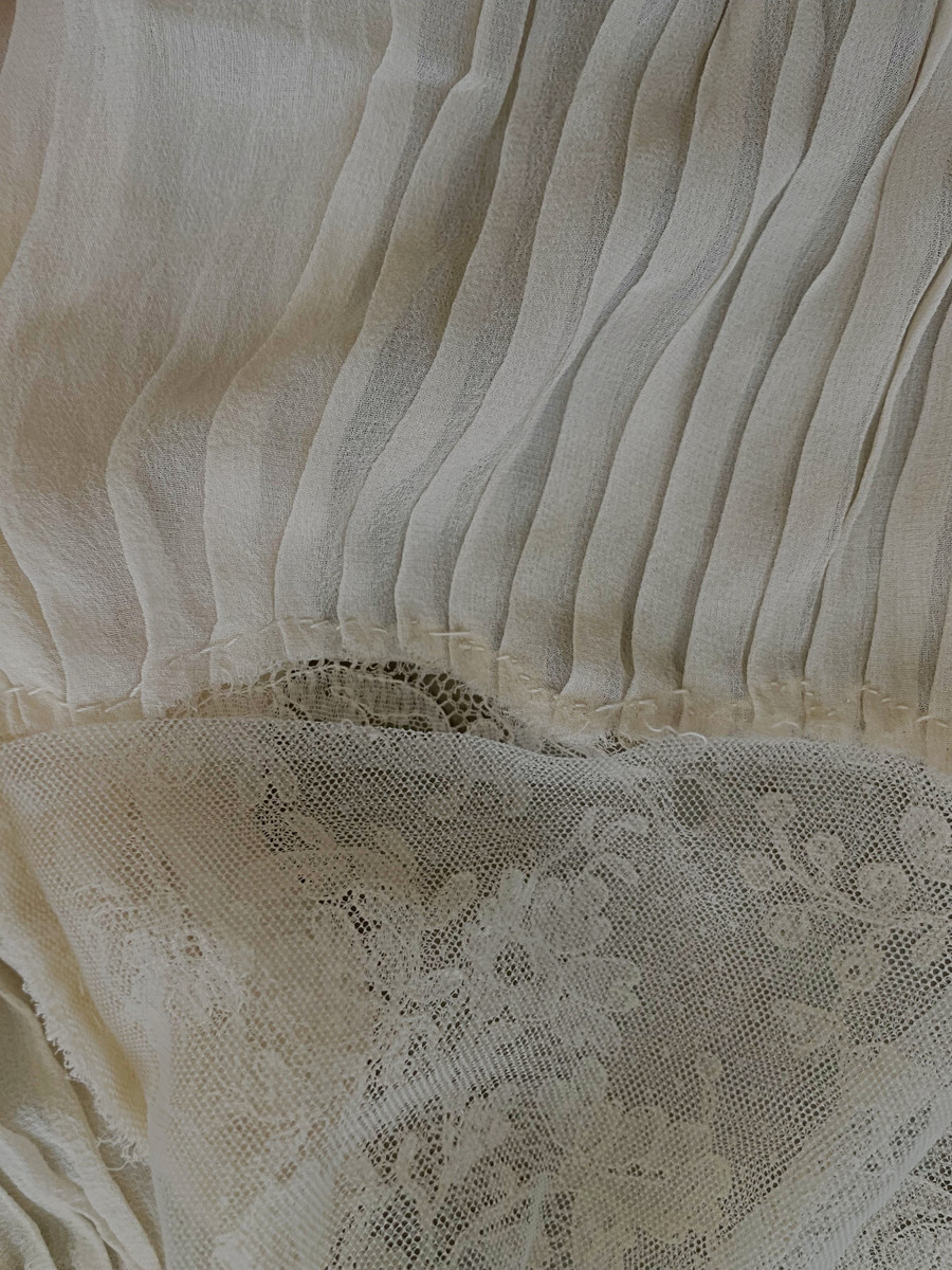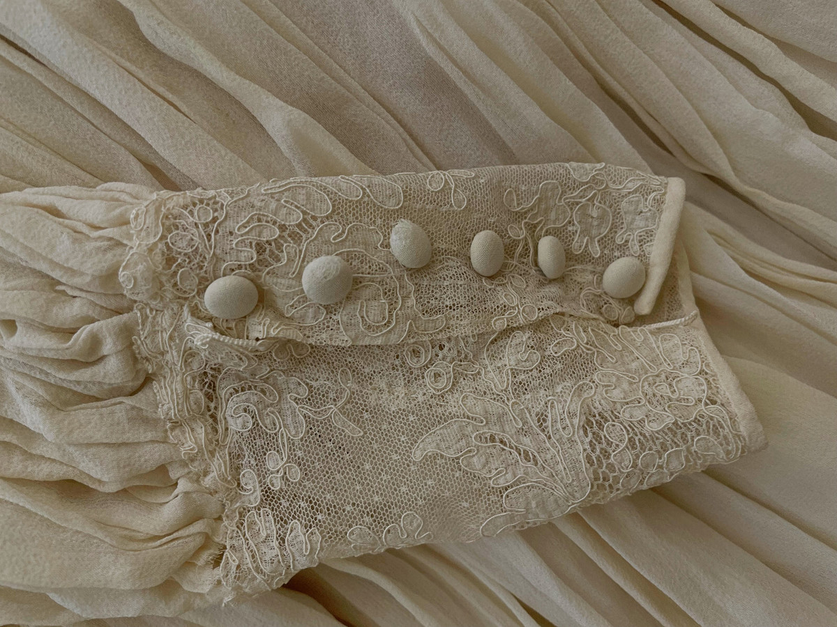 Antique 1930s handmade chiffon jacket with handmade lace to the back and end of sleeves.