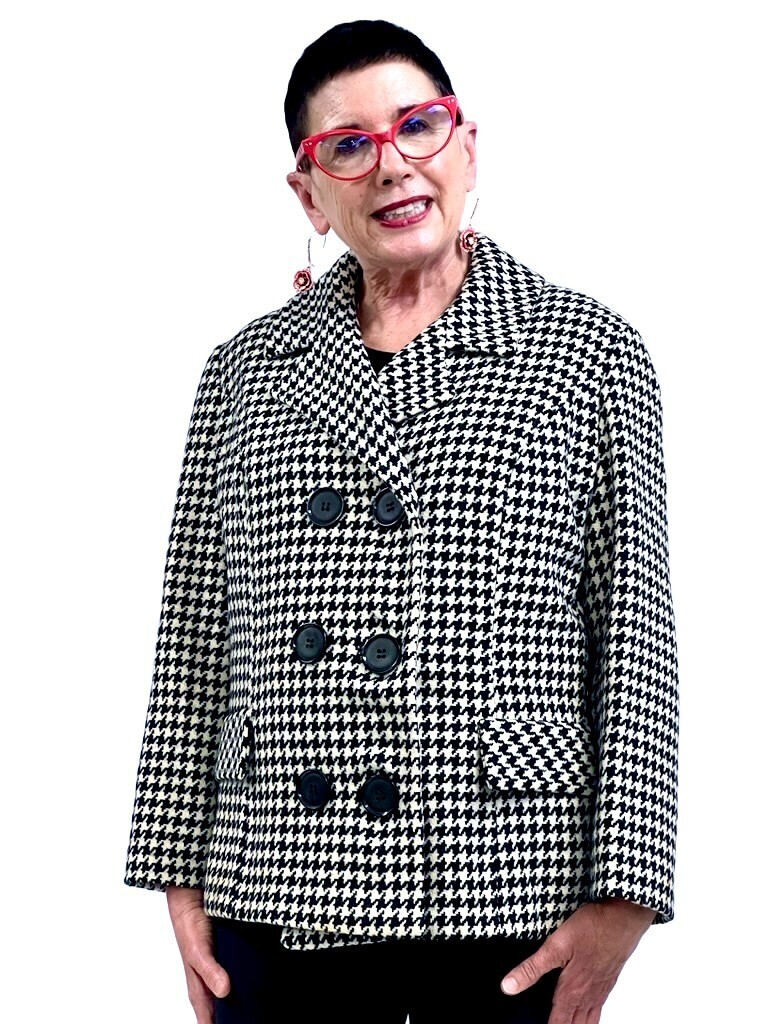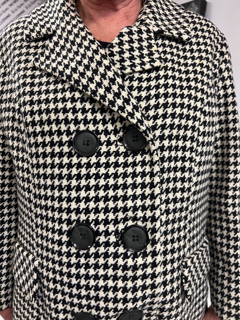 Classic vintage 1960s women?s jacket in timeless black and white houndstooth, fully lined in striking red taffeta. Features a sharp double-breasted front with bracelet-length sleeves and structured tailoring ? a chic mid-century piece that transitions seamlessly from vintage to modern styling.