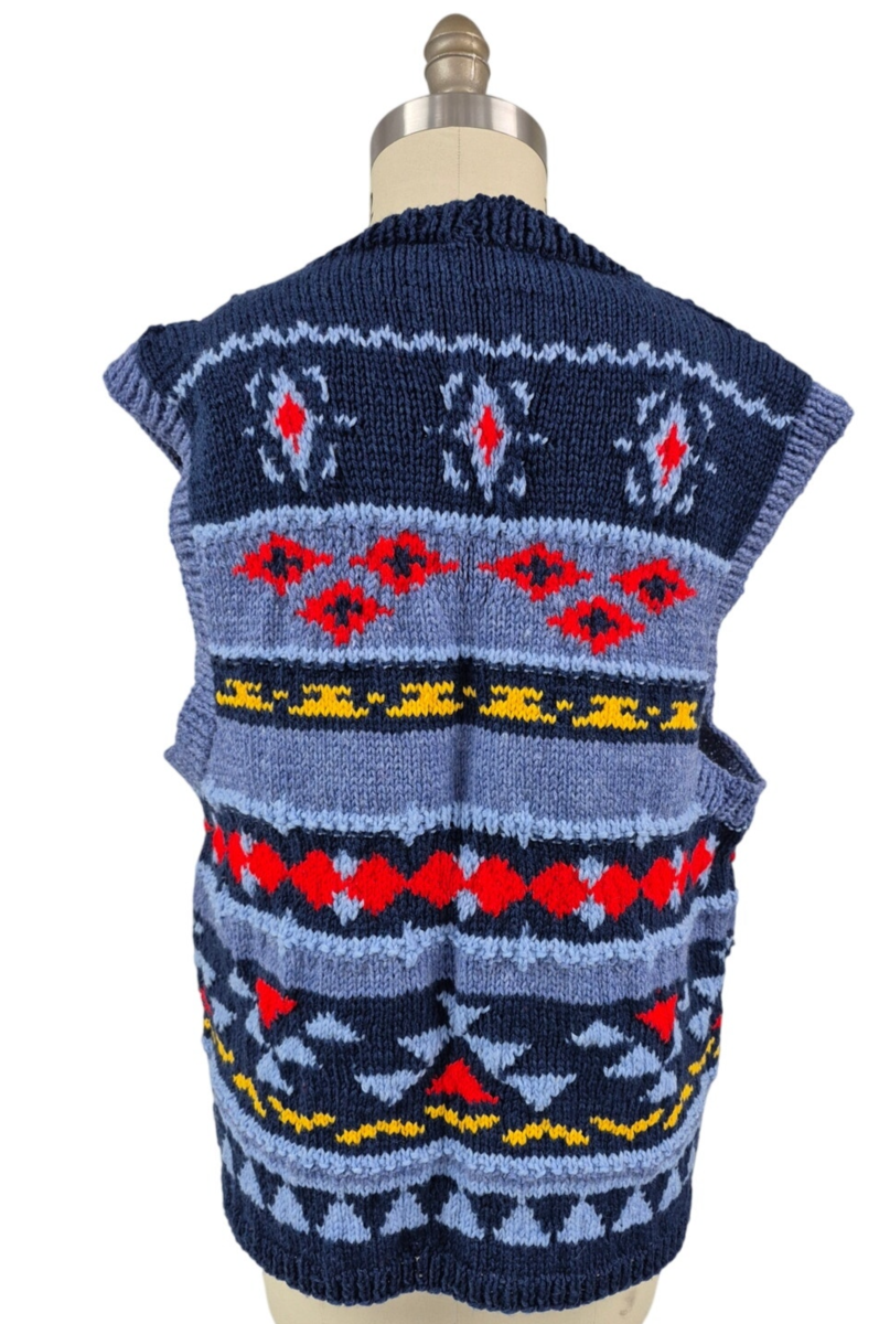 Retro 1980s?90s vintage hand-knit wool sweater vest in bold primary colors of blue, red, and yellow. A true one-of-a-kind (OOAK) piece with quirky styling ? perfect for collectors or ?ugly sweater? parties.
