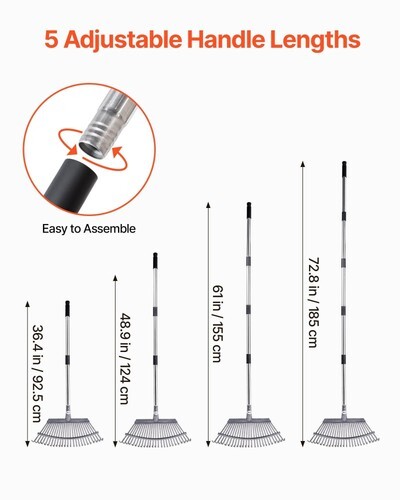 Adjustable Length: Our metal leaf rake features a segmented handle. It adjusts from 36.4 to 72.8 inches, making it easy to find the comfortable length for users of any height or raking style