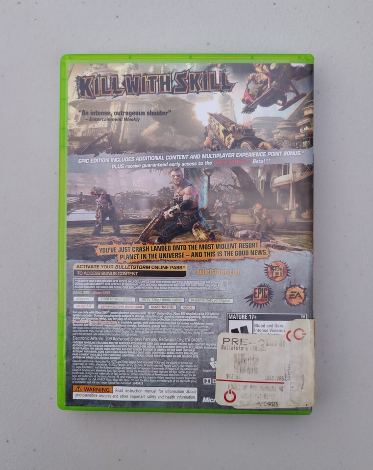 Bulletstorm is a shooter video game released by Electronic Arts in 2011 for the Xbox 360 platform. With a mature rating, players can expect a gritty and action-packed gameplay experience. The game features fast-paced combat scenarios, a unique cooperative multiplayer mode, and a captivating storyline set in a futuristic world. With its exciting gameplay and intuitive controls, Bulletstorm is sure to provide hours of entertainment for fans of the shooter genre.