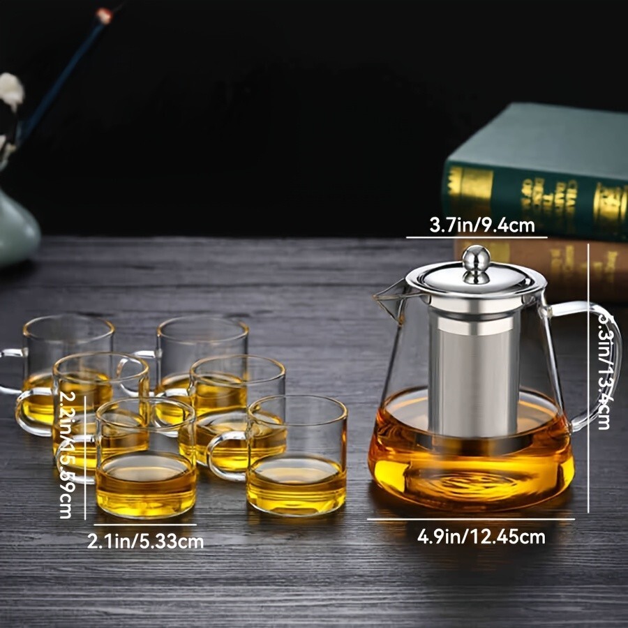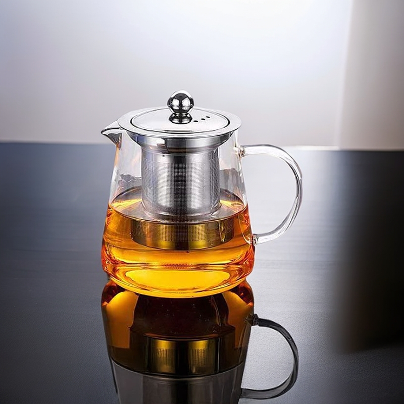 ?Removable Infuser?This glass teapot has a removable glass infuser. This infuser is made of 18/8 stainless steel and has an ultra-fine strainer that can filter most teas. You can use this glass tea pot to brew loose leaf tea, tea bags, blooming camellia, fruit tea, herbal tea.