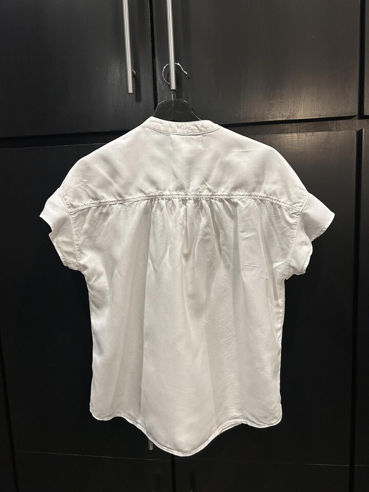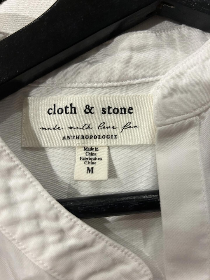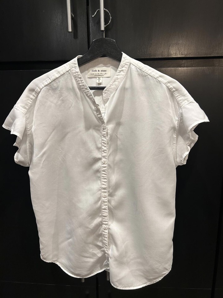 White short sleeve blouse from cloth stone, made for Anthropologie. Features a mandarin collar and button-down front. Lightweight and comfortable for casual or office wear. Size medium. Made in China.