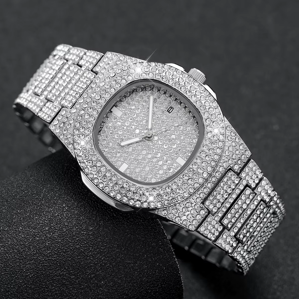 Luxury Full Diamond Men's Stainless Steel Watch Sports Quartz Wristwatch with Ca