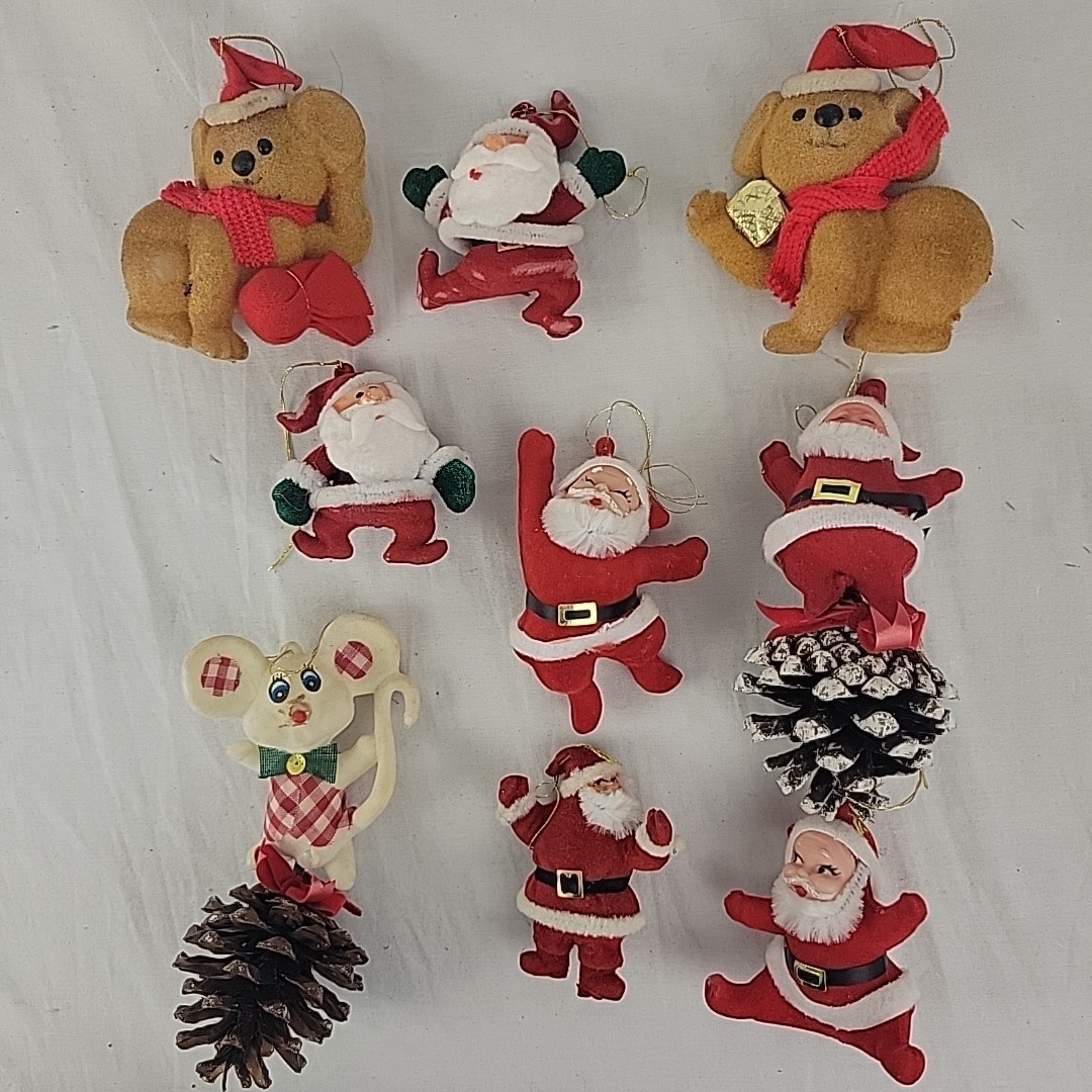 This Lot of 9 Vintage Flocked Ornaments is in Decent Condition despite showing signs of wear