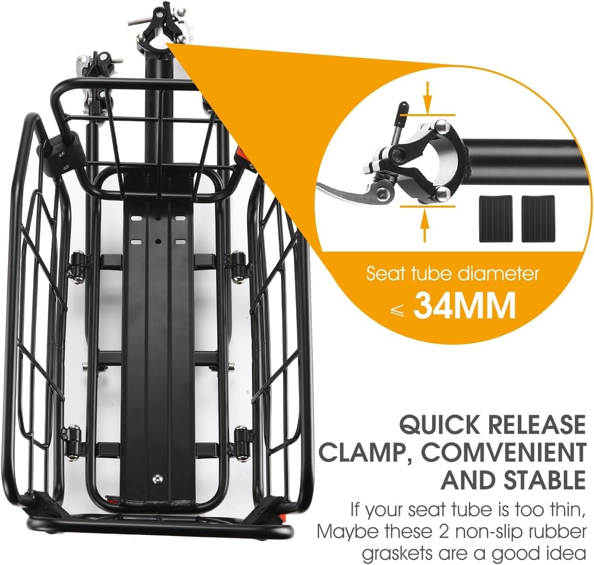 ??Installation and release?Fit Seat tube diameter: ?34MM. Easy to install and come with tools and installation instruction. Bicycle luggage rack has a quick release clip for easily mount on the seat post. Rear bike rack can be attached to the seat tube by simply fastening the screw. All part of the bike rack carrier for panniers are well organized in different part. Simply attach the part to the bike without asking for the bolt is too long, you can cut the excess part.)