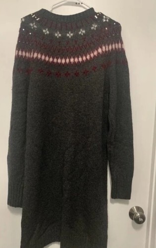 The J. Crew Gray Jewel Embellished Fair Isle Cozy Sweater Dress is a stylish and versatile piece perfect for various occasions. Made from a cozy wool blend, this knee-length sweater dress features a classic Fair Isle pattern with rhinestone accents, adding a touch of sparkle. The long sleeves and pullover closure make it easy to wear during the winter and fall seasons. With its XL size and flattering silhouette, this dress is a great addition to any wardrobe, especially for those who appreciate a preppy or retro style. Size xl. New without tag.