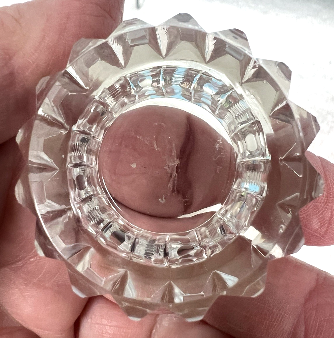 Vintage Crystal Zipper Pattern Cut Glass Open Salt Dip Cellar 7/8" Tall. Nice condition zipper edge pattern cut glass polished rim and bottom open salt cellar dip measures approx. 7/8" tall and 1 5/8" wide, no damage or signs of use, might need some cleaning. See pictures. we have 4 matching price is for 1