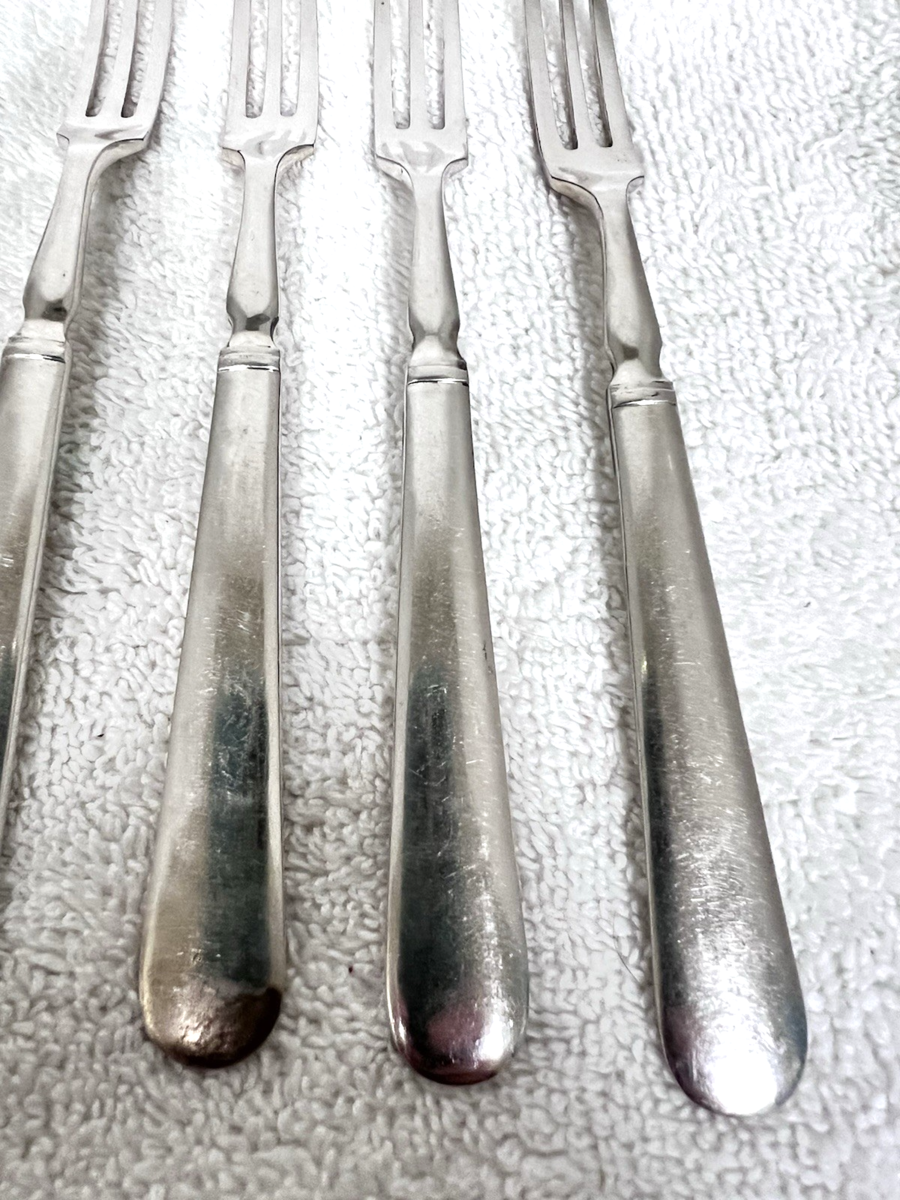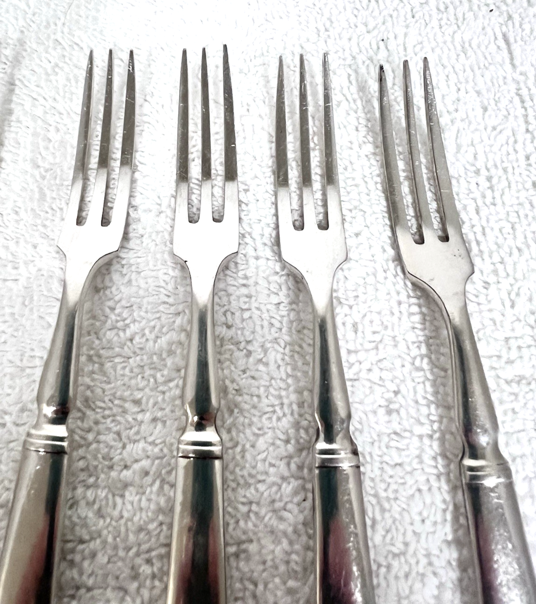 Vintage Wallace Silverplate RW S Four Pattern Fish Forks 6 Forks Plus One Extra 6" Long. 3 Tine fish forks measure approx. 6" long, no monogram, some light surface scratches, very nice used condition. See pictures.