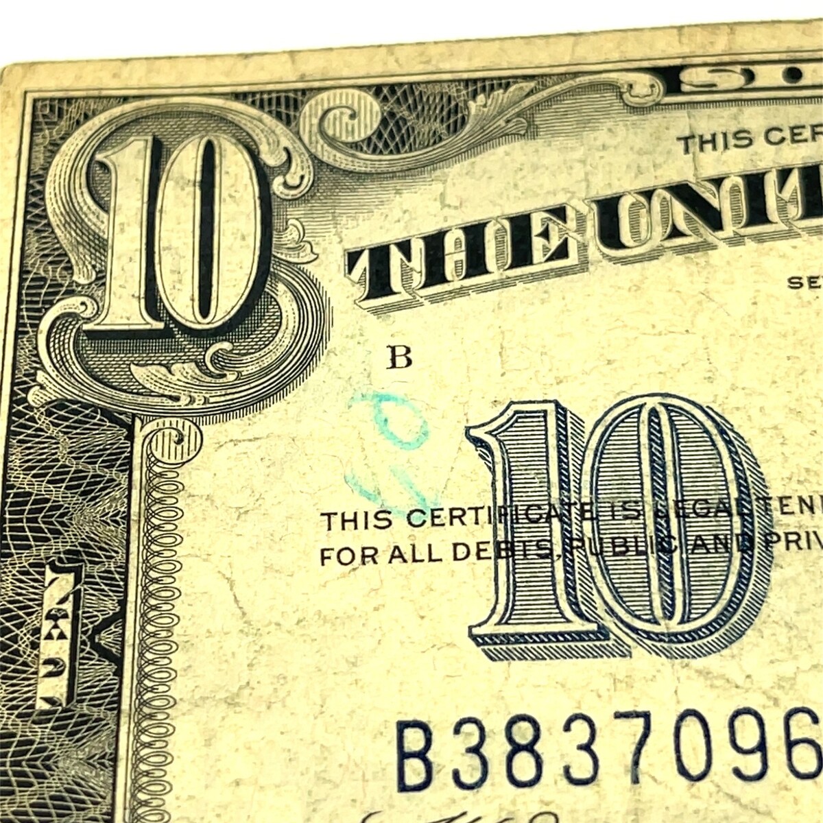 Condition Notes: Very Fine+ Condition. Even margins. Edges are sharp with minor creases. One vertical and one horizontal fold. Creases and fold lines all over the bill. No tears. Normal discoloration and yellowing from age and use. Staining on both sides of the bill. Blue-colored graffiti on the obverse to the left of the portrait. Overall, good condition, with normal signs of aging and wear.