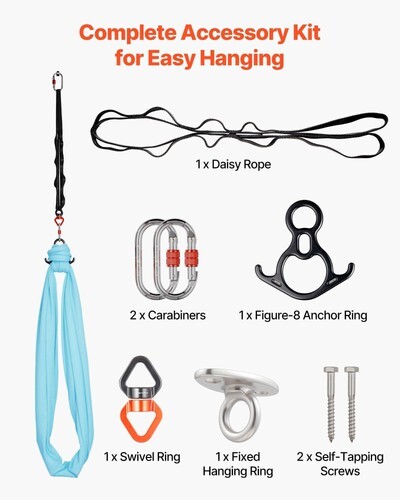 Fast Setup Kit: Equipped with all necessary mounting accessories, this yoga hammock allows tool-free installation in minutes. Quickly transform it into a swing, making it ideal for yoga, stretching, or relaxing at home, in studios, or outdoors, offering a convenient and adaptable solution