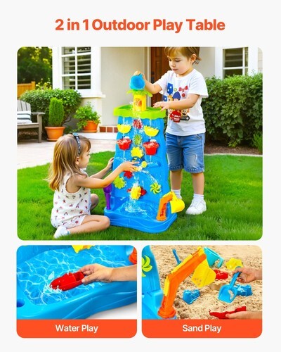 2-in-1 Versatile Fun: VEVOR sand and water table comes with 37pcs rich accessories, including water windmills, coconut trees, beach tools, water wheels, excavator, boat, etc. With these accessories, children can engage in interesting activities like creating a coconut tree waterfall, building a sand engineering team, and experiencing the thrill of water drifting