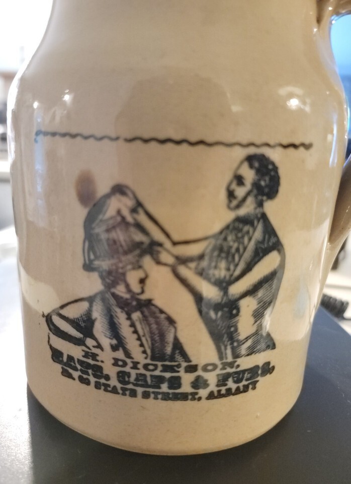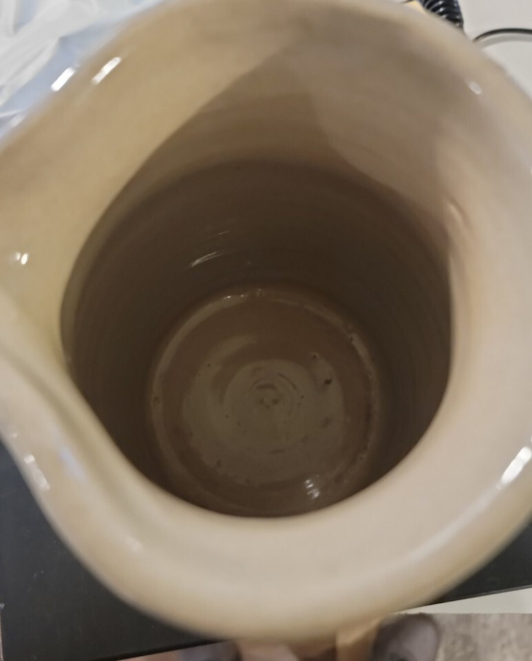 Vintage Pearson's of Chesterfield Stoneware Pitcher w/ Blue Promotional Graphic.Has brown stain on front and a line on the lip which are imperfections made while being made. Otherwise good condition.