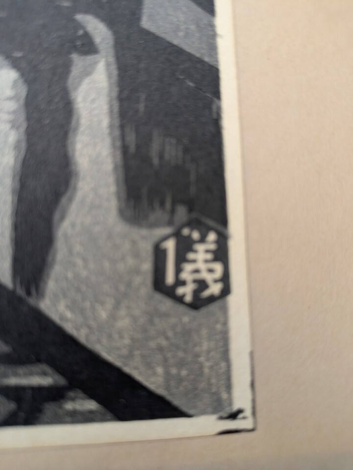 Japanese Chinese Woodblock Print Black White People Umbrella Gihachiro Okuyama