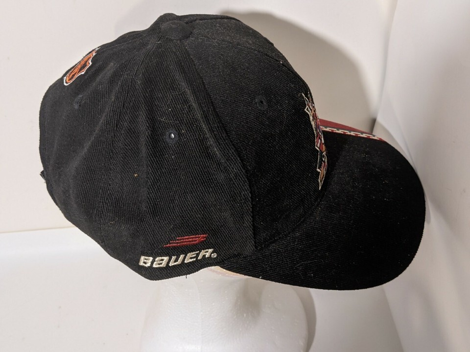 Up for sale is a new unworn 1990s NHL Phoenix Coyotes Bauer Center Ice Hook Loop Embroidered Hat Cap Black.