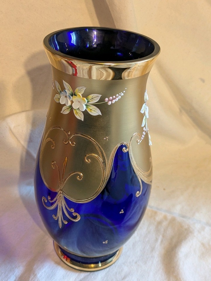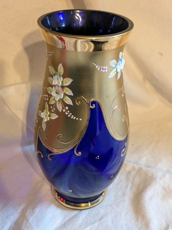 Vintage Cobalt Blue Bohemian Czech Crystal Vase Flowers 24kt Gold 10 in Tall