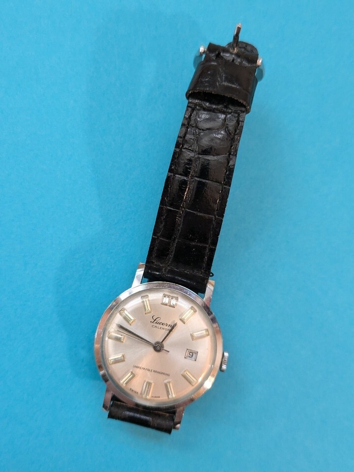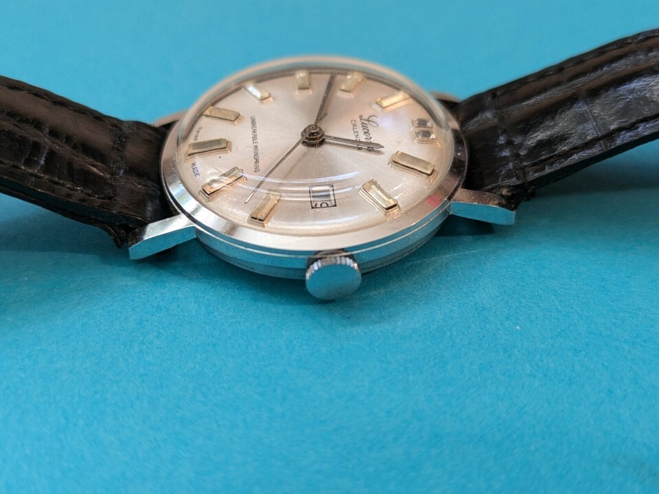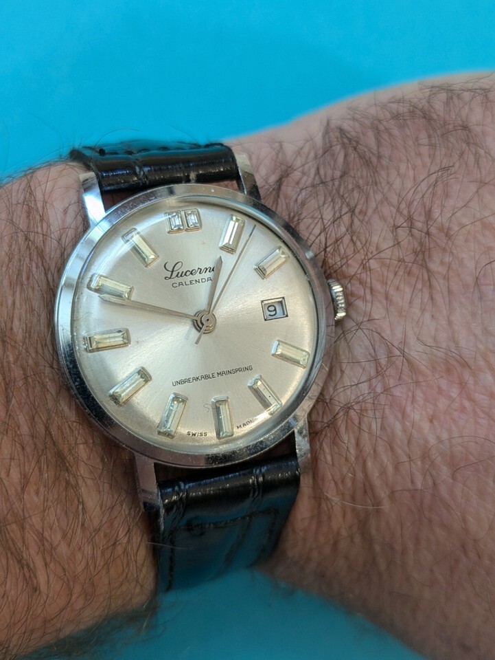 This vintage Lucerne wristwatch is a classic timepiece for men with a 34mm silver case and black band. The watch features stick indexes on a white bezel and an analog display. It is working and ready to wear. The watch is not customized and belongs to the Wristwatches, Watches, Watches Parts Accessories, and Jewelry Watches categories. The brand is Lucerne, and the case and band colors are silver and black, respectively.