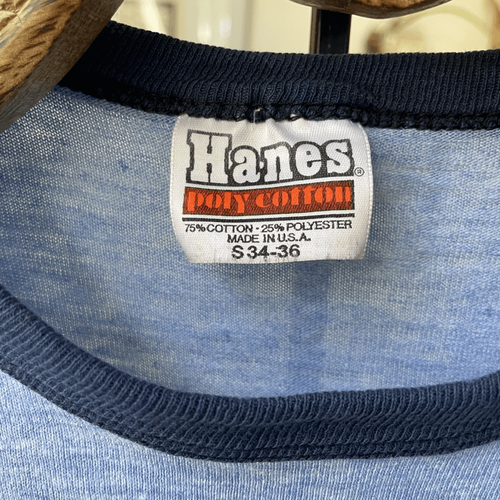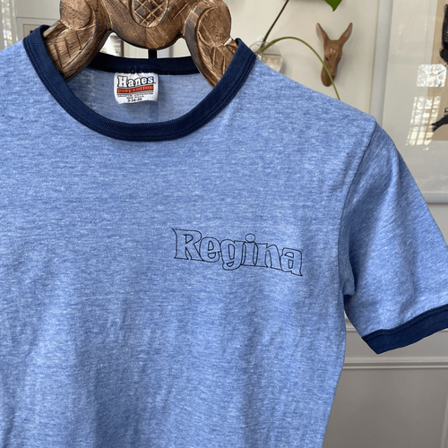 Vintage late 70s early 80s Hanes ringer T-shirt with blue Heather T-shirt and dark blue ringer trim at neck and sleeve. Cotton and polyester blend with, ?Regina? in a retro font. Regina is an all Catholic high school in my area and this T-shirt belong to a former student. The overall effect is in my opinion very retro. The T-shirt does have some stretch and measures 24 inches shoulder to hem and 16 inches armpit to armpit. No noted flaws. Based on the measurements, I believe this fits closer to a modern size extra small so I am listing it as such but please double check measurements to ensure the proper fit for you.