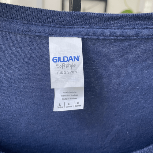 Gildan women?s scoopneck 100% cotton, dark blue T-shirt with a muted gold, celestial graphic of the sun, moon and clouds. Very bohemian. Laying flat measures 20 inches armpit to armpit and 26 inches shoulder to him.