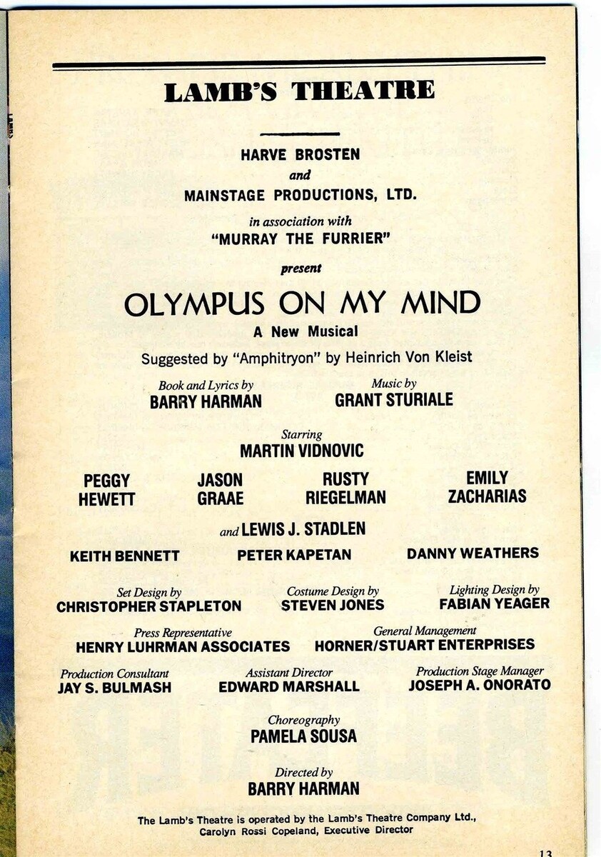 Playbill Olympus On My Mind 1986 Martin Vidnovic Peggy Hewett Lewis Stadlen