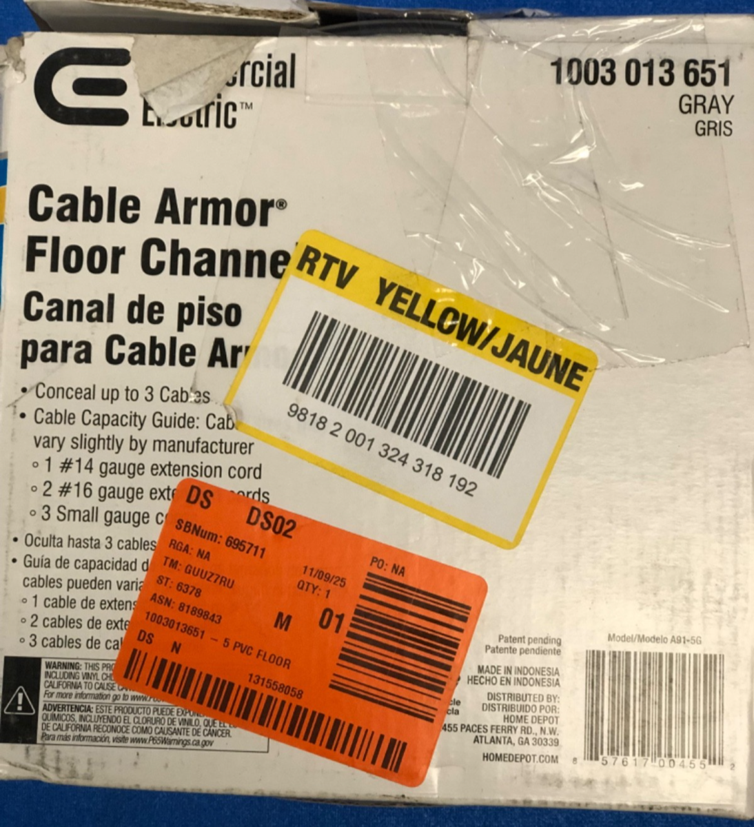Commercial Electric 5’ Cable Armor Floor Channel Gray Fabric 1003 013 651