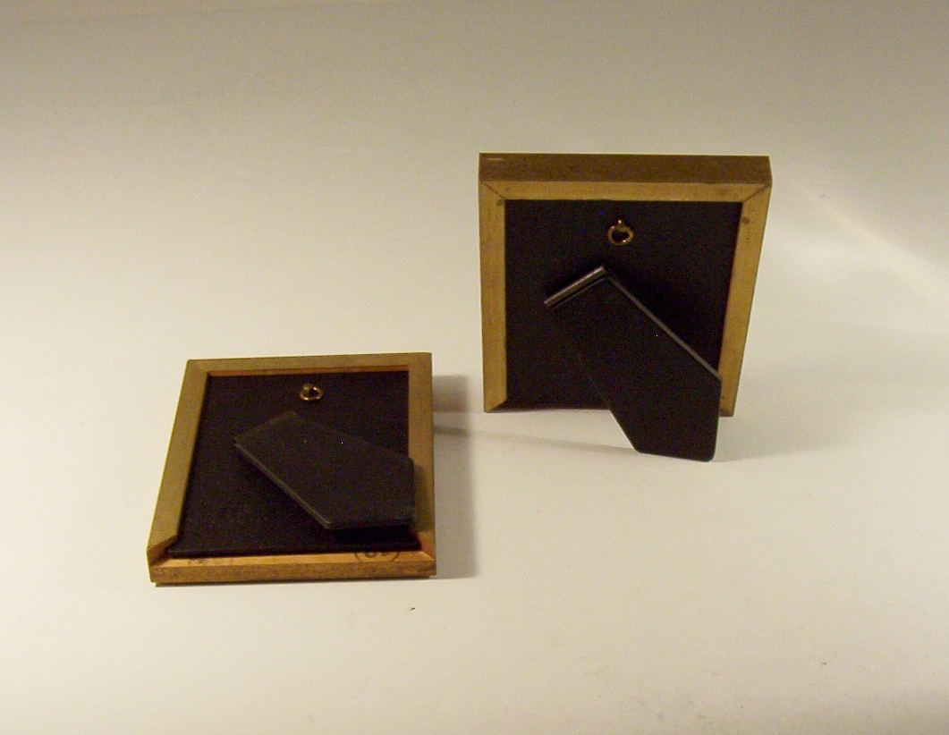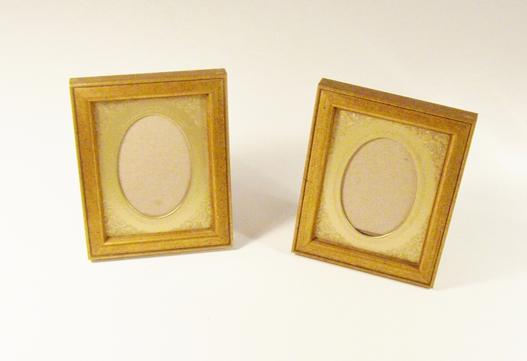 These two vintage 1970s wood photo frame are made by Burnes. The rectangular shape with its delicately embossed oval metal mat adds a touch of elegance to any room. The rear-loading design makes photo insertion easy, while the clear glass front showcases your cherished photo.