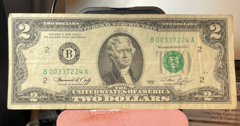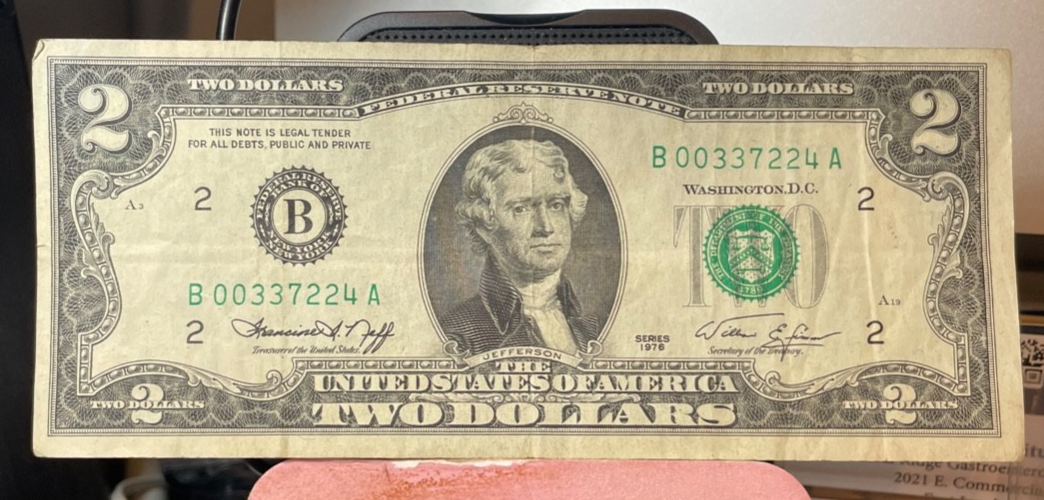 1976 2 dollar bill Low Serial #B 00337224 A Circulated
