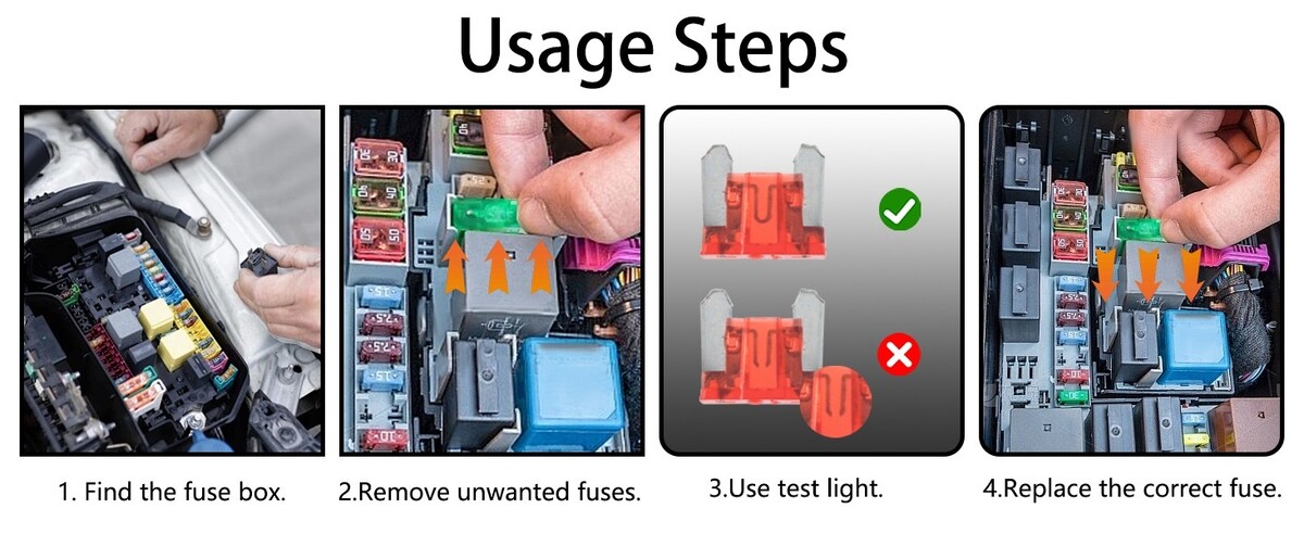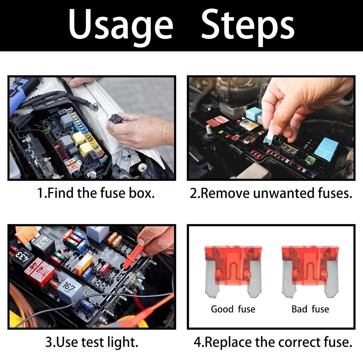 ?Easy Installation?Replacing a fuse is even simpler than replacing a light bulb! You only need to follow three steps: 1. Find the auto fuse box under the steering wheel. 2. Remove the old fuse 3. Insert the new fuse of the corresponding color (hear a "click" to install it). The transparent shell design allows you to see at a glance whether it is blown (the silver metal wire is broken).
