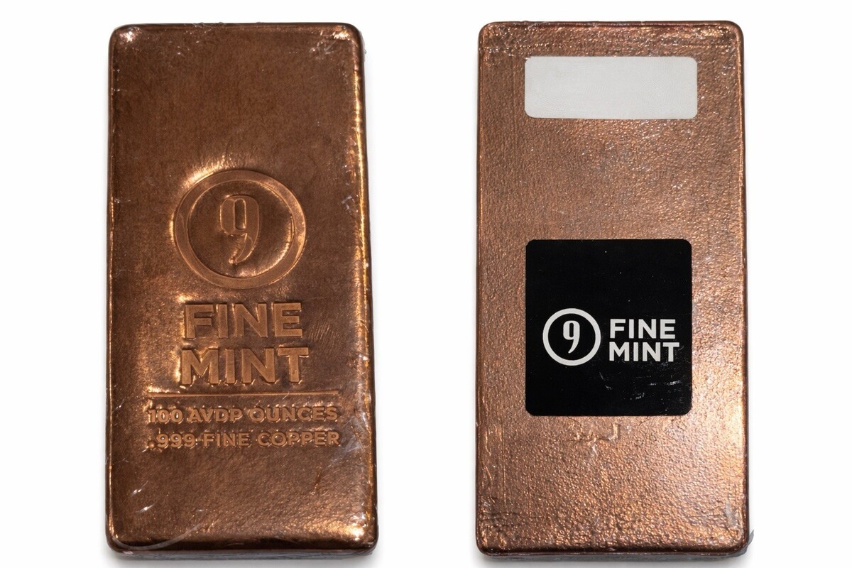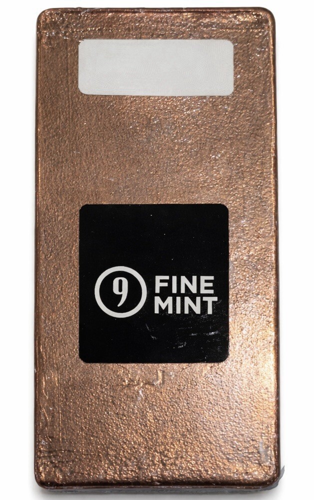 Stunning cast-poured copper bullion bar in it?s Original wrapping from 9Fine Mint. This substantial 100 AVDP ounce bar is struck in .999 fine copper and features the bold 9Fine Mint hallmark with classic poured texture and natural copper luster. Weighing approximately 7 pounds, this is a heavy, impressive bullion-style bar ideal for metal investors, collectors, preppers, or display. Comparable copper pricing averages around $90 per pound, giving this bar strong intrinsic copper value plus collectible mint premium. Bar is in hand and ships securely. Every order ships safely securely from Joshua?s Card Coin Shop.