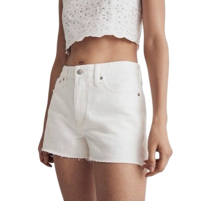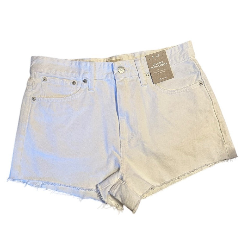 Madewell Relaxed Mid-Rise Denim Shorts in White Wash. Style Code ND717. MSRP $78. Women?s Size 29. Sold out on Madewell website. Got high ratings from customers. Shipped with USPS Ground Advantage.