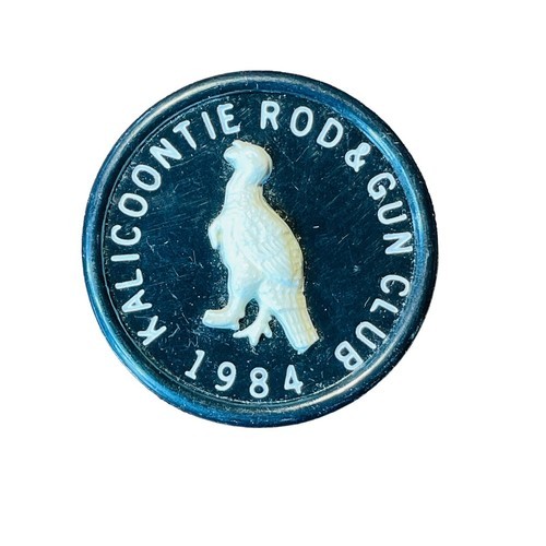 This vintage pinback button is a must-have for collectors of memorabilia related to hunting and fishing. The KALICOONTIE Rod Gun Club c 1984 . Black plastic Pinback Button features the name of the club along with an applied plastic pheasant and the dates of 1984. The original location of the club was in Glenco Mills, NY in Columbia County. It later relocated to Livingston NY. It is a rare find that is sure to be a valuable addition to any collection of pinbacks.