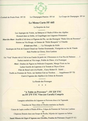 A 4 panel L'Auberge De Noves Friends of French Art Signed Menu. Dated May 18, 1994 From this Relais and Chateaux France. With signature of what may be the Chef Owner Robert Lalleman.