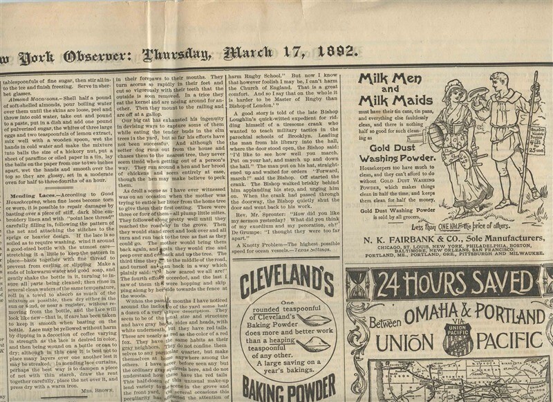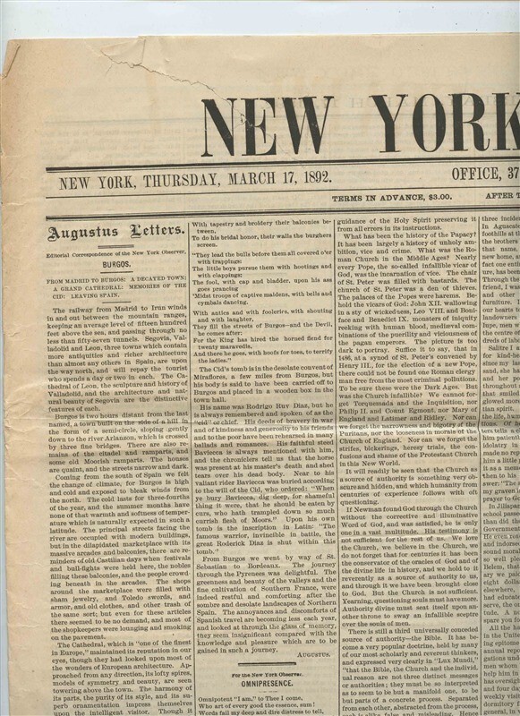 A complete 8 page issue of this large format newspaper. Pages measure about 18 1/2" x 25". New York Observer Newspaper Volume LXX No 11 March 17, 1892