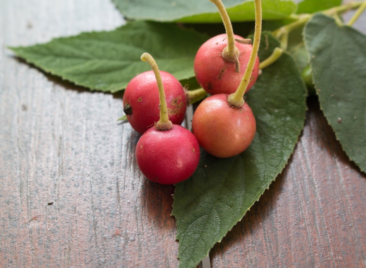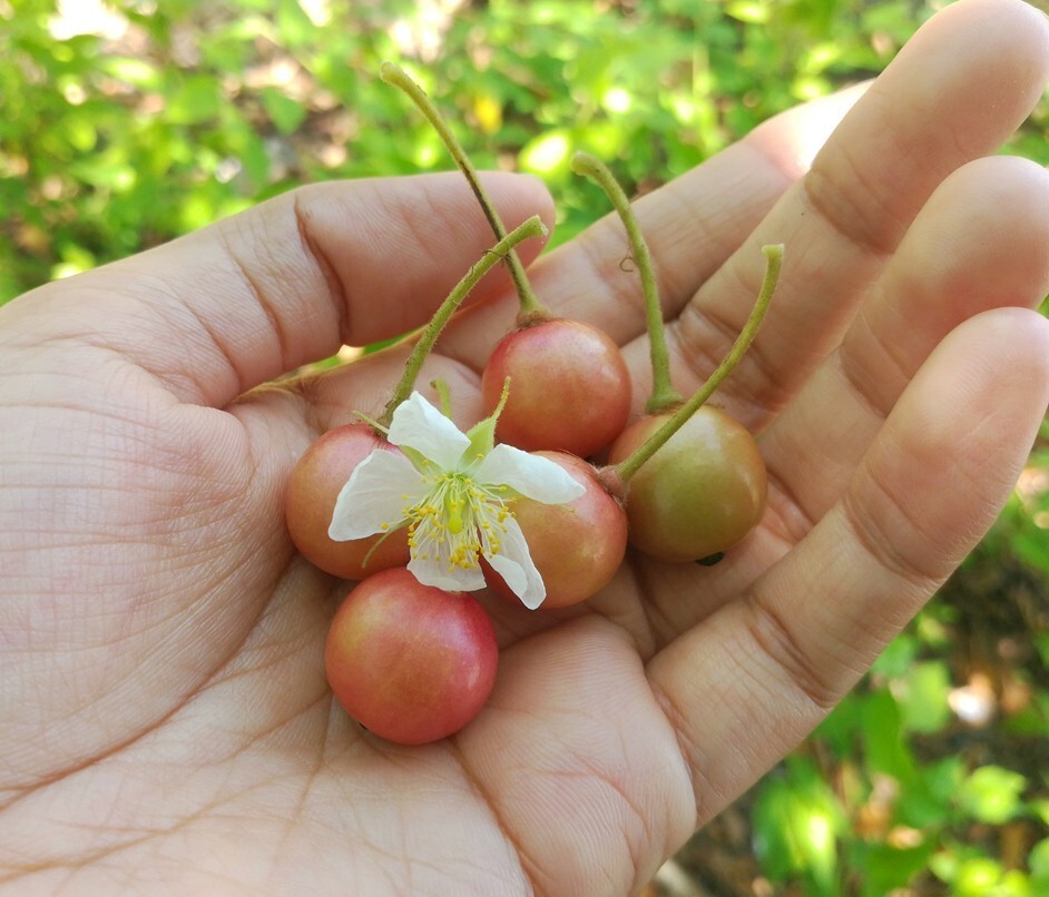 his plant produces small red fruits that birds love and people snack on fresh off the tree.