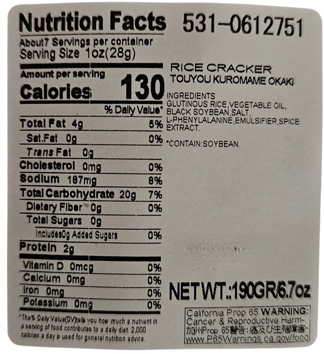 The listing is for one (1) pack of TOYO SEIKA KUROMAME OKAKI - Japanese Baked rice Crackers with black beans, 190g