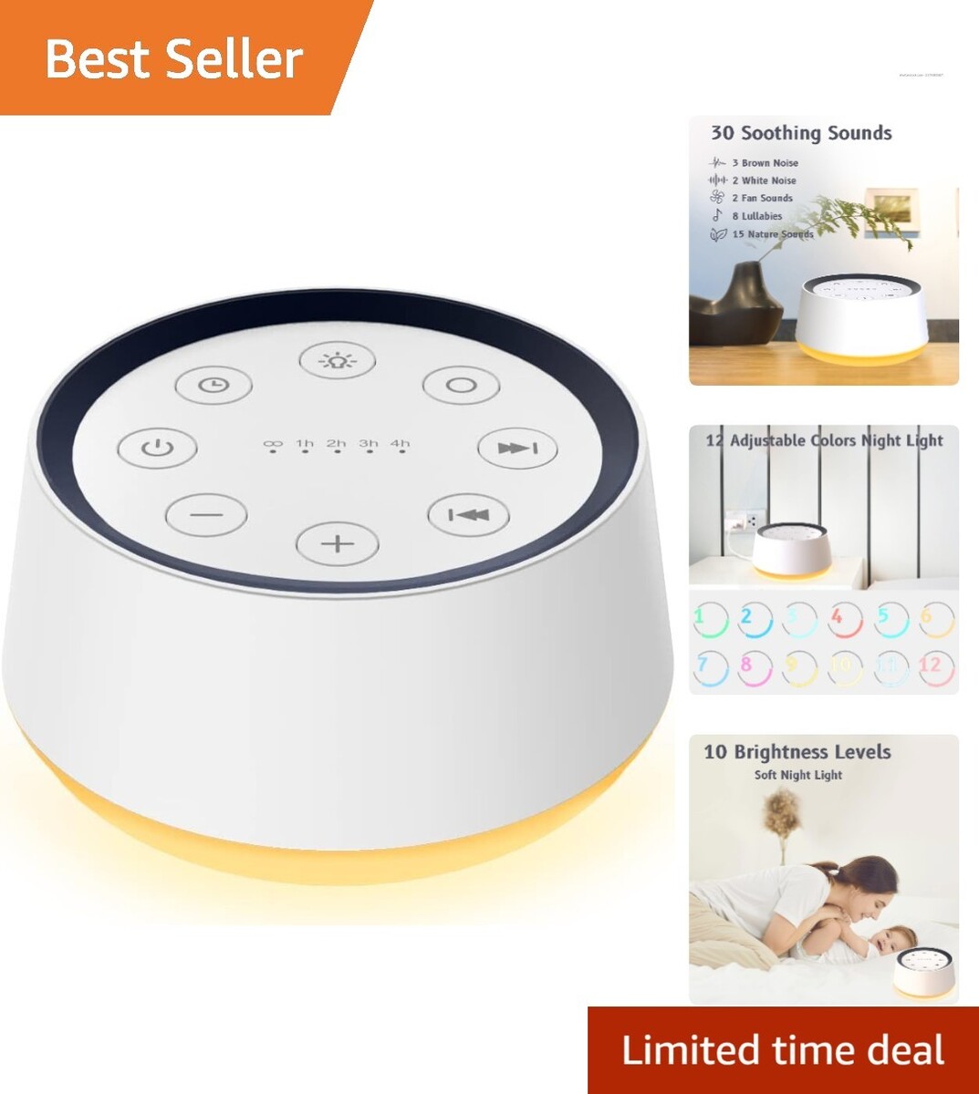 **30 Natural and Soothing Sounds:** Includes choose from 3 Brown noises, 2 White noises (White noise, Pink noise), 2 fan noises (Loud and Soft Fan), 8 lullabies, and 15 natural sounds (Rain, Sea Waves, Brook, Bird, Train, etc.).