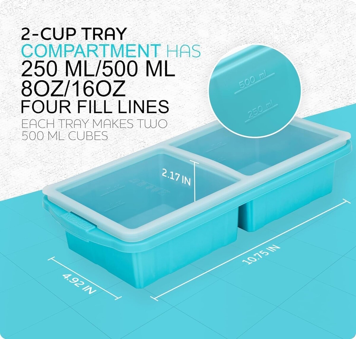 PERFECT PORTION CONTROL: Each silicone mold holds 2 cups, with compartments specifically scaled with 250ml/8oz and 500ml/16oz markers, allowing you to create two 2-cup or 500ml cubes for larger meal servings.