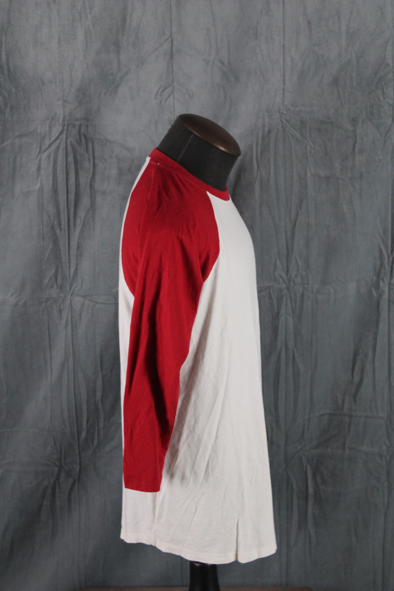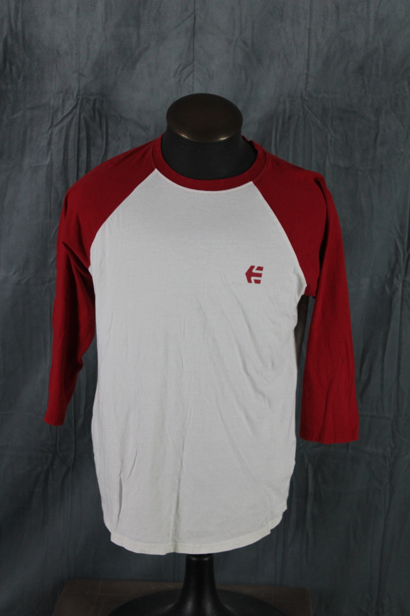 Up for sale is a skateboard shirt. It has a 3/4 sleeve with a white body and red sleeves. The front of the shirt has the Etnies E logo screened on the left side. What a great shirt do not miss out on it.