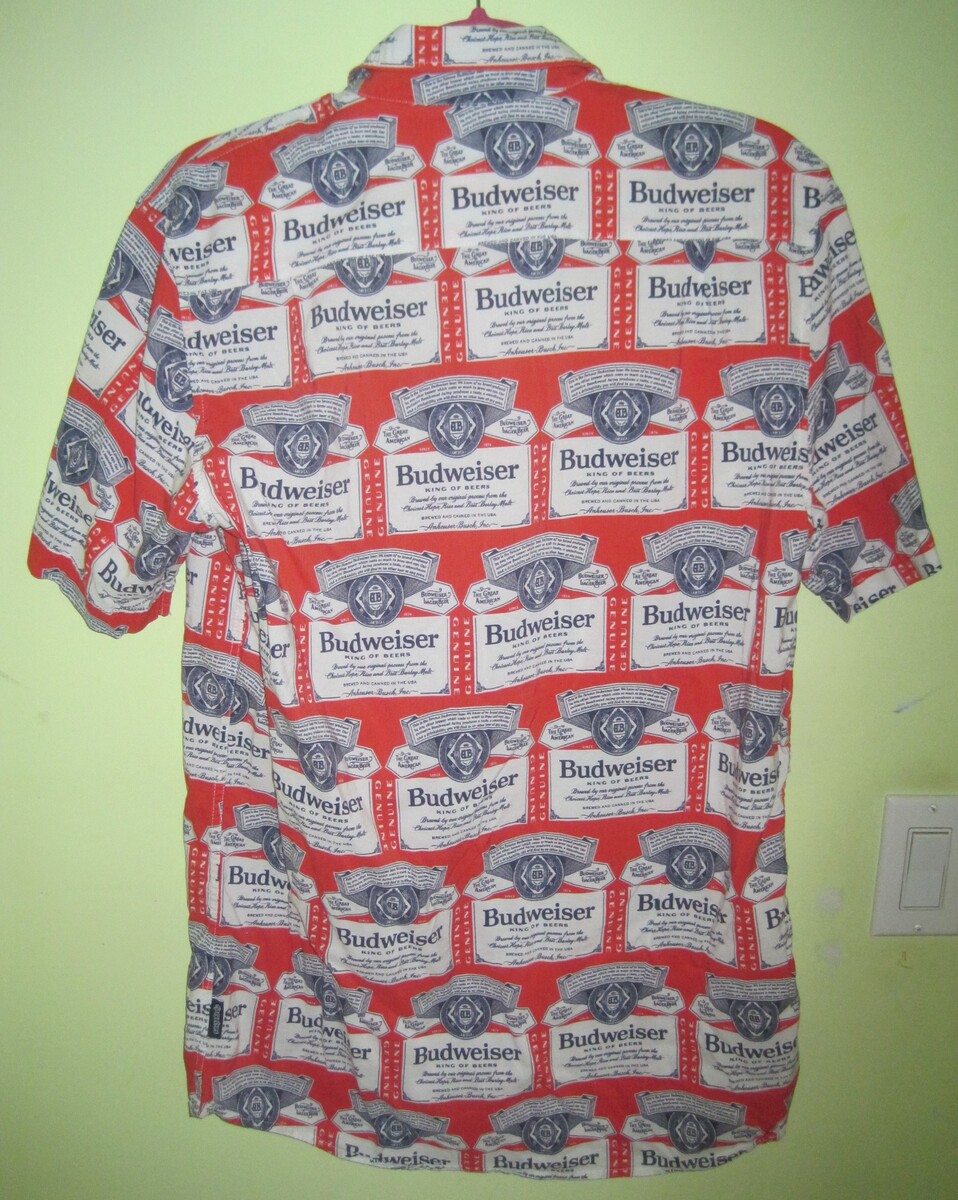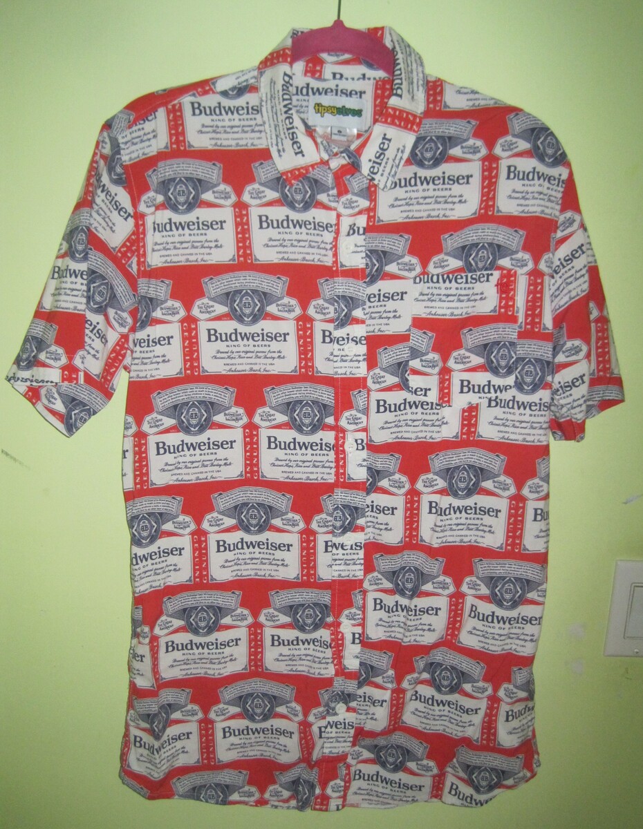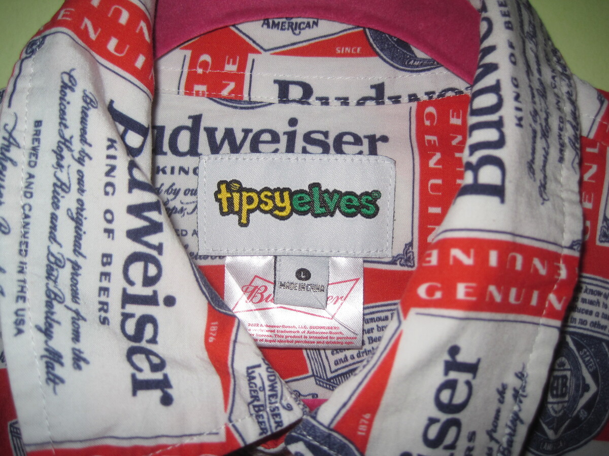 TIPSY ELVES Budweiser Beer Short Sleeve Button Up Men's Shirt. Size Large. It is in great condition. Hardly worn!