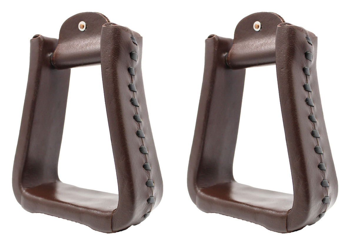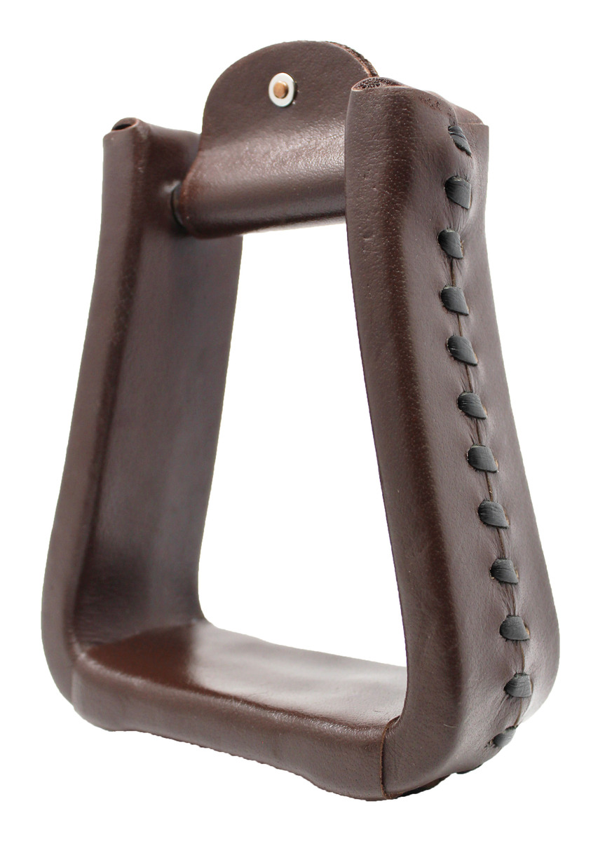 Challenger western stirrups wrapped in dark brown leather. Leather tread gives added traction in wet conditions. Inside measurements are 5" wide, 5 1/2" tall, 3" neck, and 3" tread.