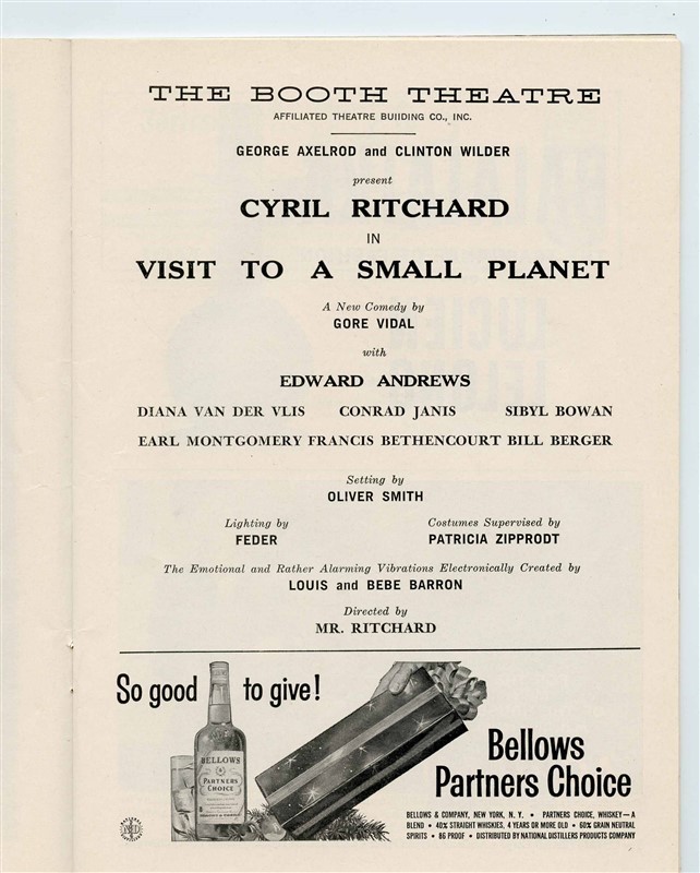 From the Booth Theatre in New York City during December 1957 . A Playbill from Visit to a Small Planet , starring Cyril Ritchard, Edward Andrews, Diana Van Der Vlis, Conrad Janis and Sibyl Bowan . In fine condition.
