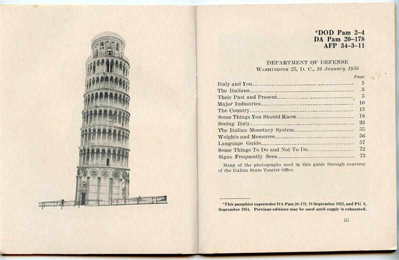 A 76 page illustrated booklet. A Pocket Guide to Italy. From the Department of Defense, this is dated 1956